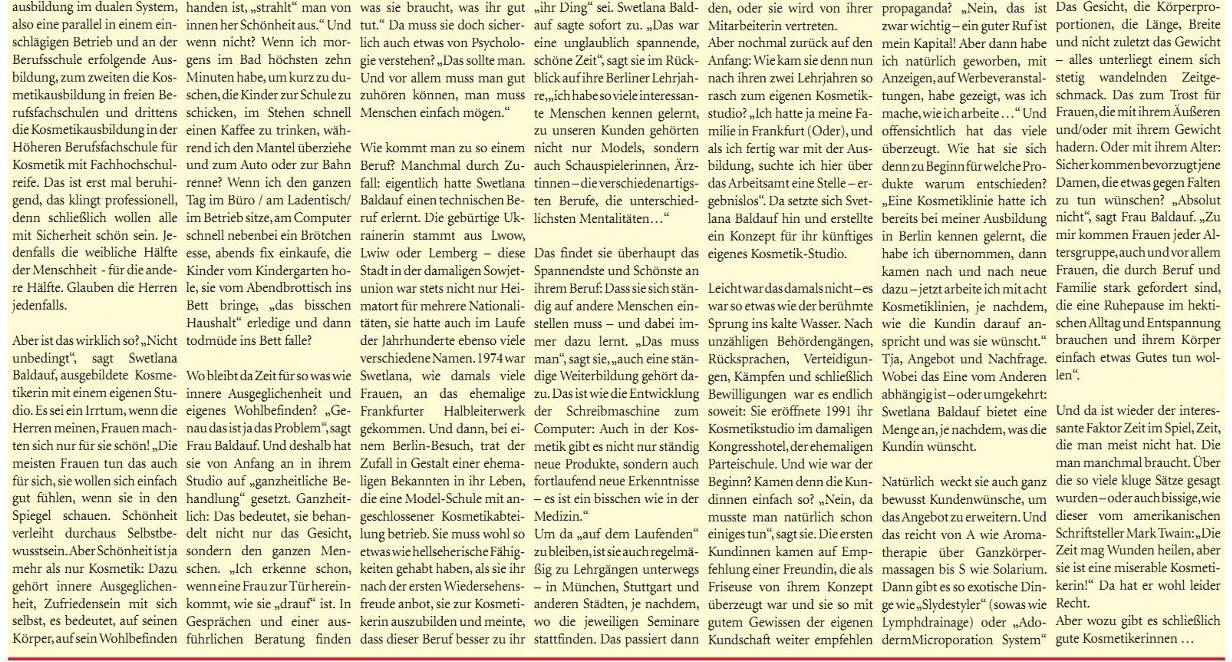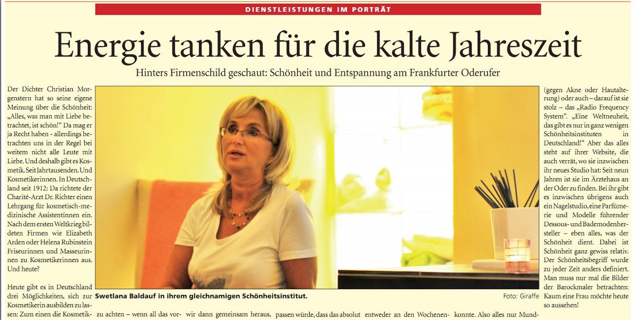| Das Schönheitsinstitut Swetlana Baldauf * Institut für ästhetische Kosmetik im Ärztehaus links der Oder in Frankfurt (Oder), Uferstraße 3 Tel.: +49 (0) 335 24285 Disclaimer Haftungsausschluss Datenschutzerklärung |
